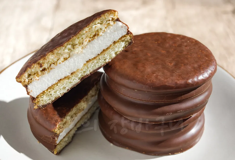 냉장실에 보관했다가 시원한 상태로 먹어도 마찬가지였는데 오리온 초코파이의 마시멜로 보다 조금 힘이 없는 느낌에 아주 미약한 쫄깃함이 있는 듯 없는 듯한 그런 느낌. 원가 절감의 결과물일지도 모르겠다. 뭐 가격이 가격이니 어쩔 수 없겠지.